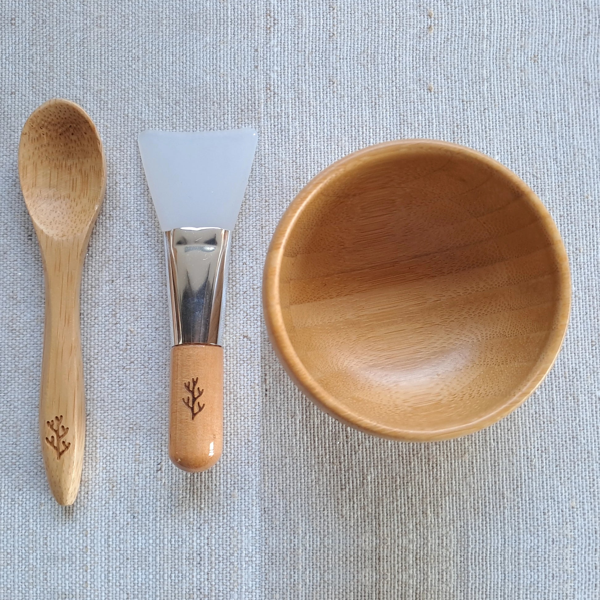 Ce kit comprend un bol et une cuillère en bambou, ainsi qu’un pinceau d’application en silicone.